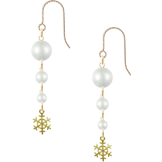 大小のパールを雪のように連ね、ゴールドの結晶モチーフを添えた冬らしいデザインのピアス。清らかな白の輝きが耳元で優しく揺れ、可憐で上品な雰囲気を演出します。