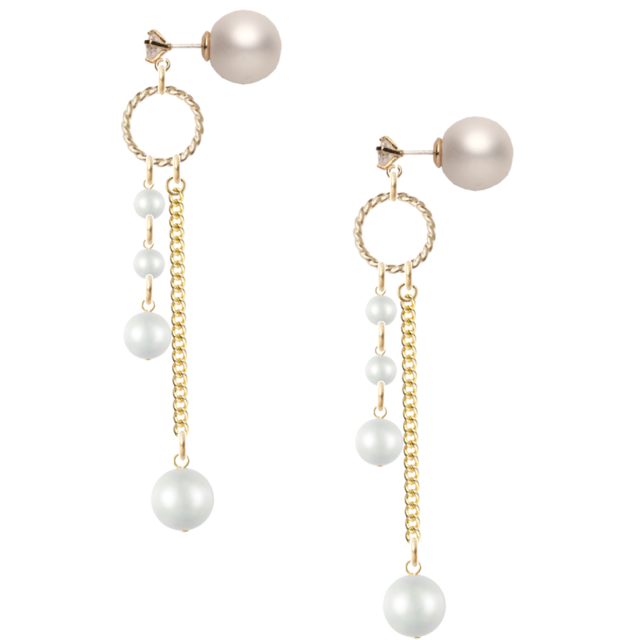 柔らかく連なるパールが耳元で優しく揺れ、光を受けてほのかにきらめく上品なピアス。シンプルながらも存在感があり、普段のオフィスやカフェでの装いをさりげなく華やかに演出します。