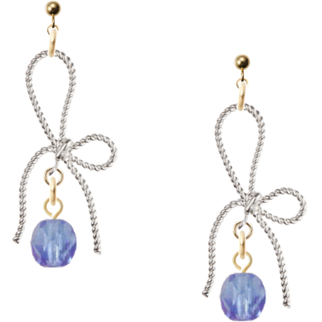 アシンメトリーなリボンモチーフに、サファイアカラーのチェコビーズをあしらったピアス。丸玉カンが上品な輝きを添え、シルバーの涼やかな質感と調和します。