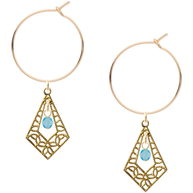 エレガントなフープデザインに、アクアマリンのチェコビーズと菱形のすかし模様が施された一品です。耳元で軽やかに揺れるフープピアスは、さりげなく魅力を引き立て、カジュアルからフォーマルなシーンまで幅広く活躍します。特別な日のおしゃれにも最適なアイテムです。