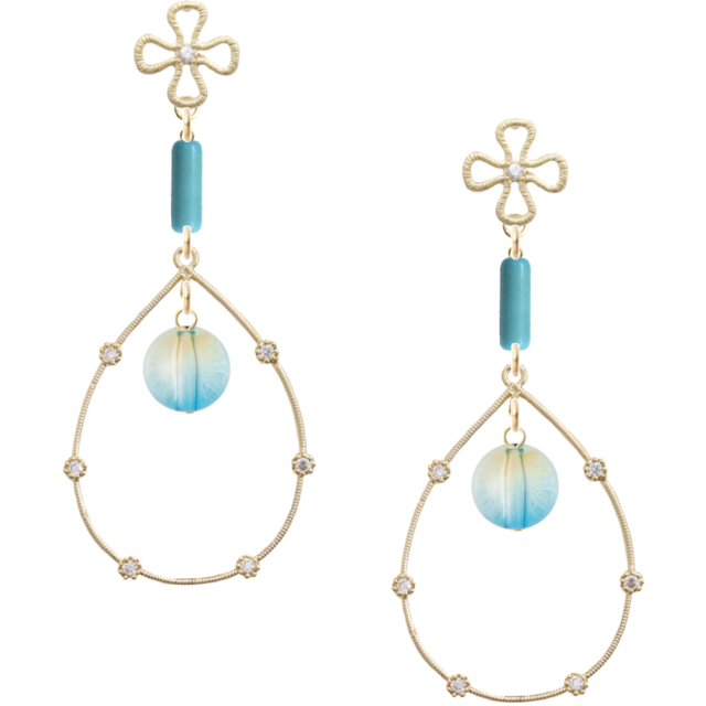 魅力的なラインストーンフープと、細かなターコイズブルーの色合いが特徴のエレガントなピアスです。耳元で華やかに揺れるこのピアスは、おしゃれ感を一層高め、カジュアルなスタイルから特別な日の装いまで幅広く活躍します。シンプルでありながら、個性的なデザインは目を引き、他のアクセサリーとも自然に調和する一品です。